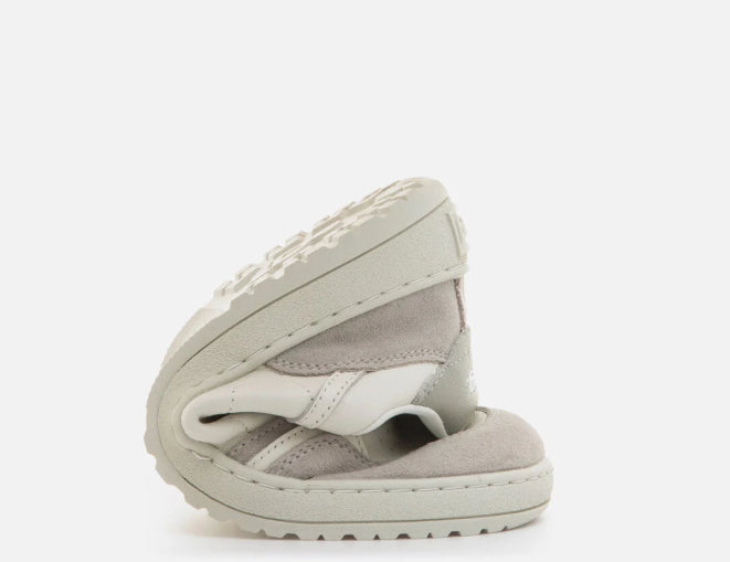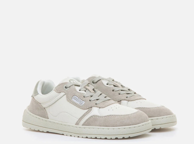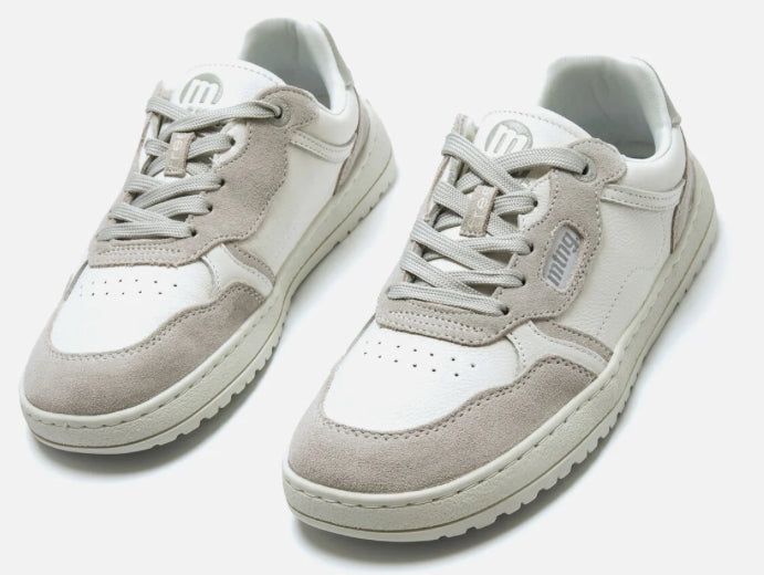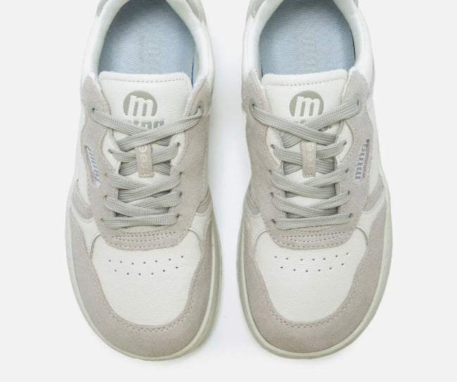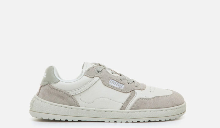 Zapatillas barefoot de color blanco roto y gris, diseñadas por Mustang para ofrecer confort, estilo y movimiento natural en el día a día. Fabricadas en piel con paneles lisos y piezas de serraje, aportan textura, durabilidad y un look moderno y versátil. Su suela totalmente plana (zero drop) y cierre de cordones a tono aseguran un ajuste cómodo y una pisada natural.