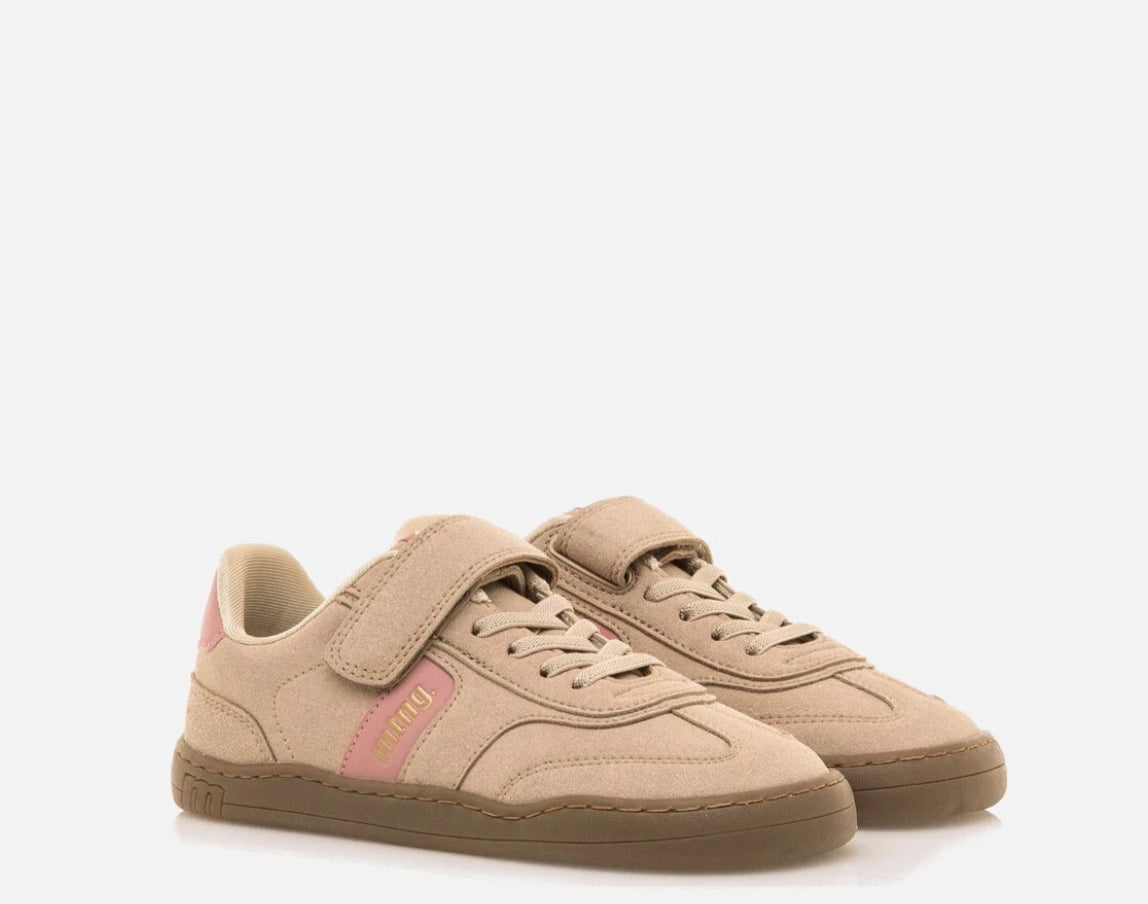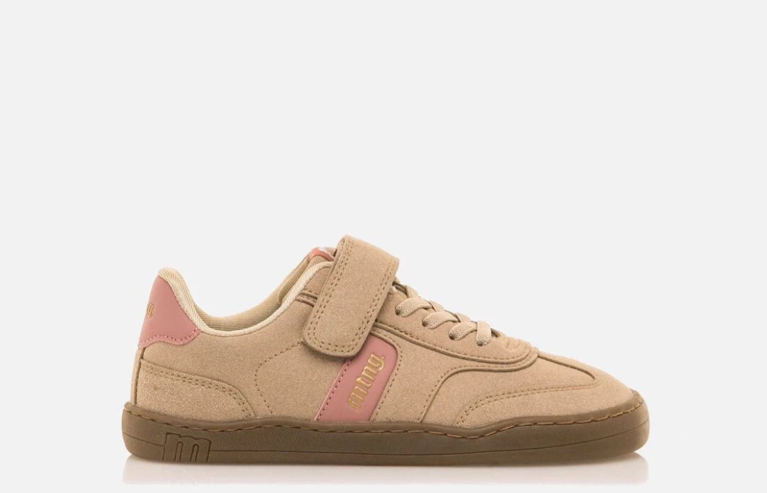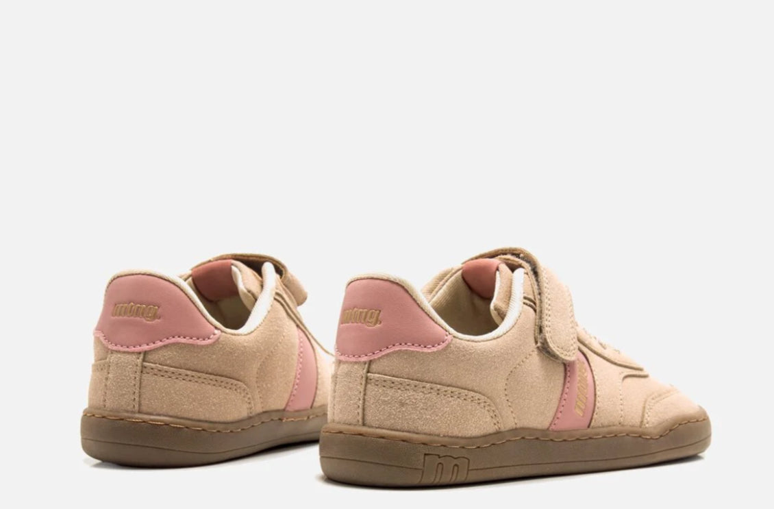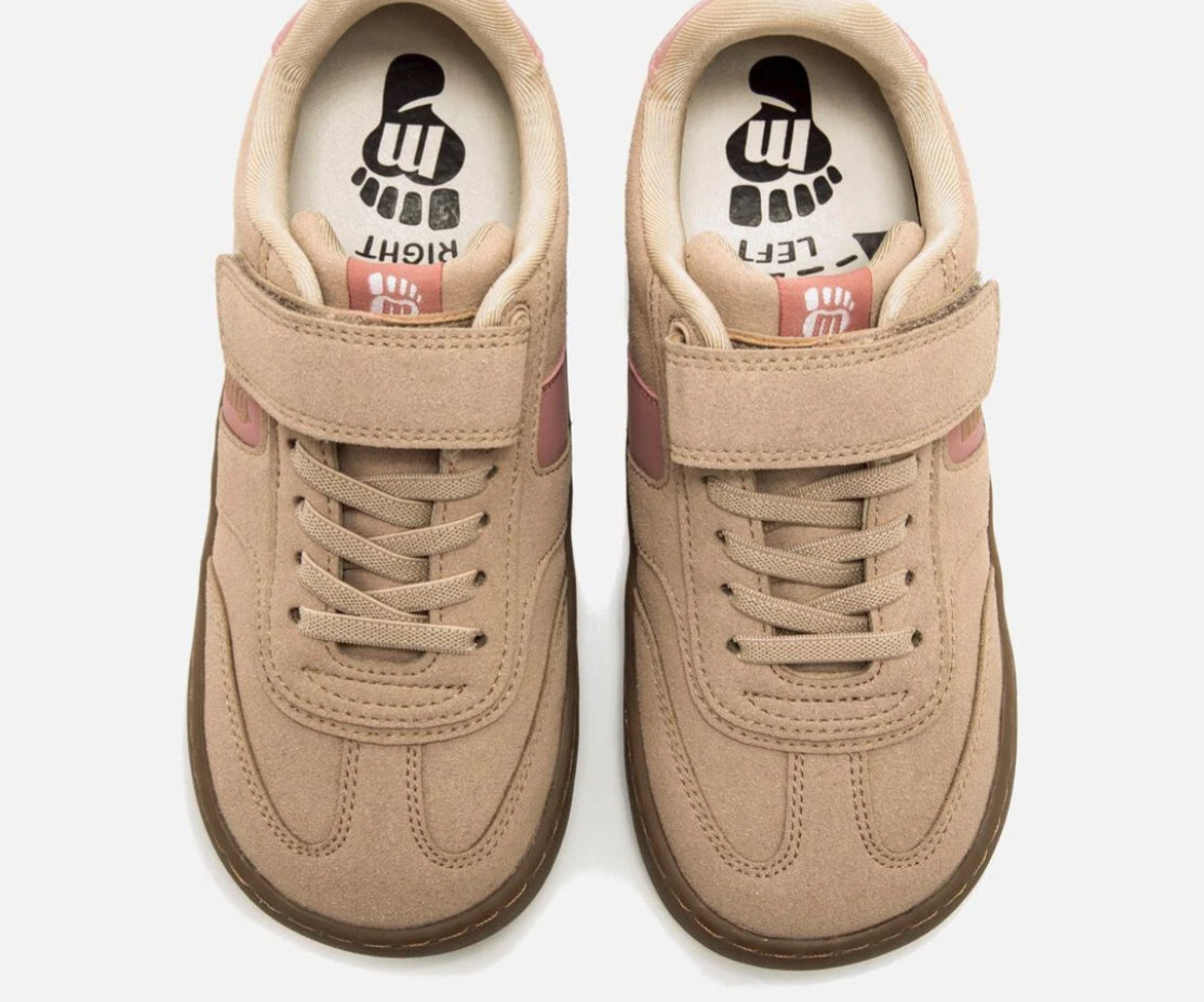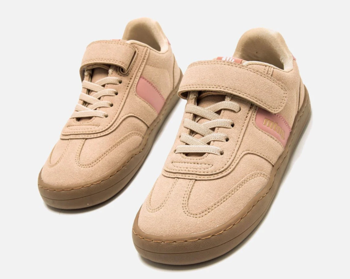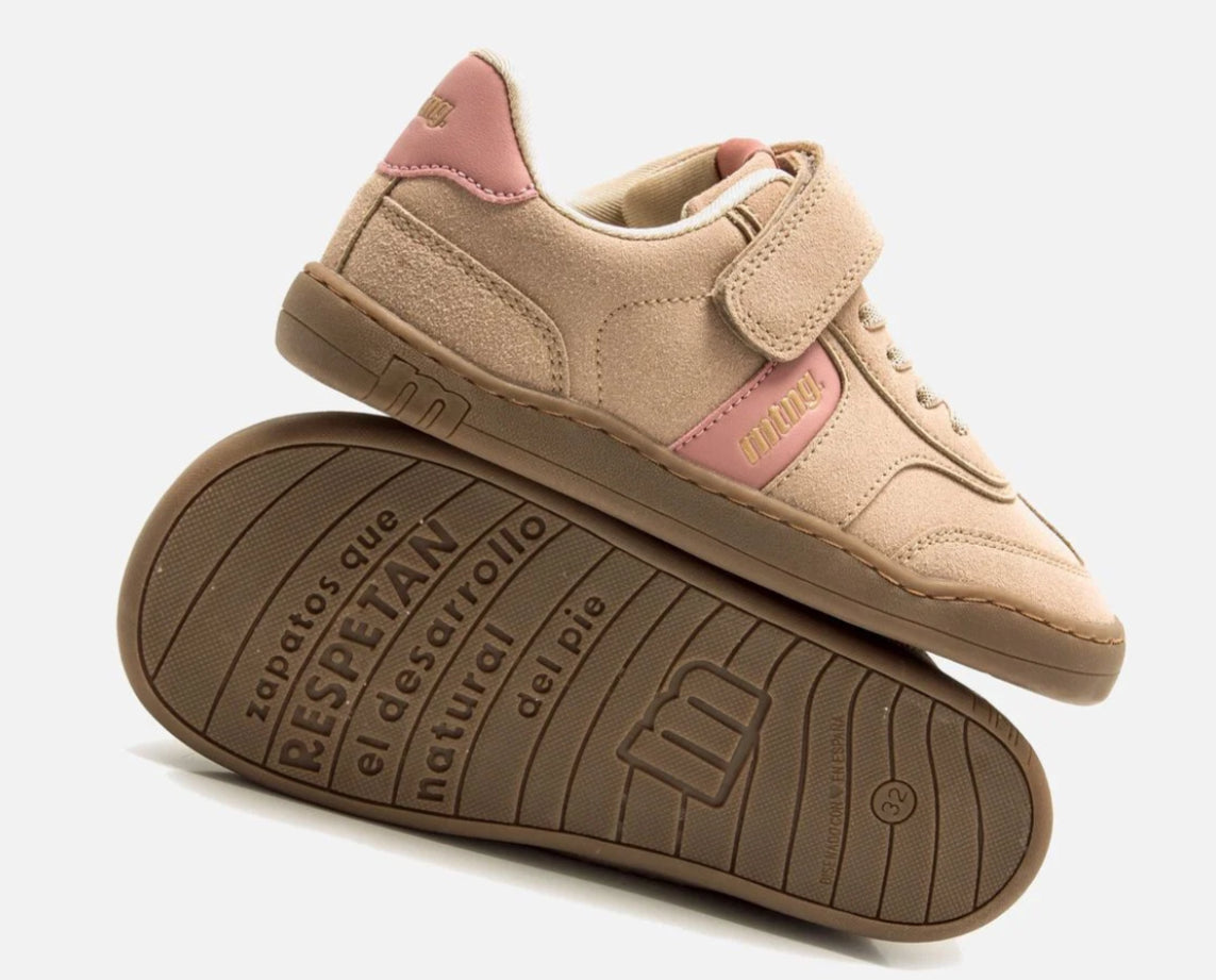 Zapatillas de color crudo con detalles en rosa, diseñadas en colaboración con el Dr. Juanjo López, traumatólogo deportivo e infantil, para respetar el desarrollo natural del pie.