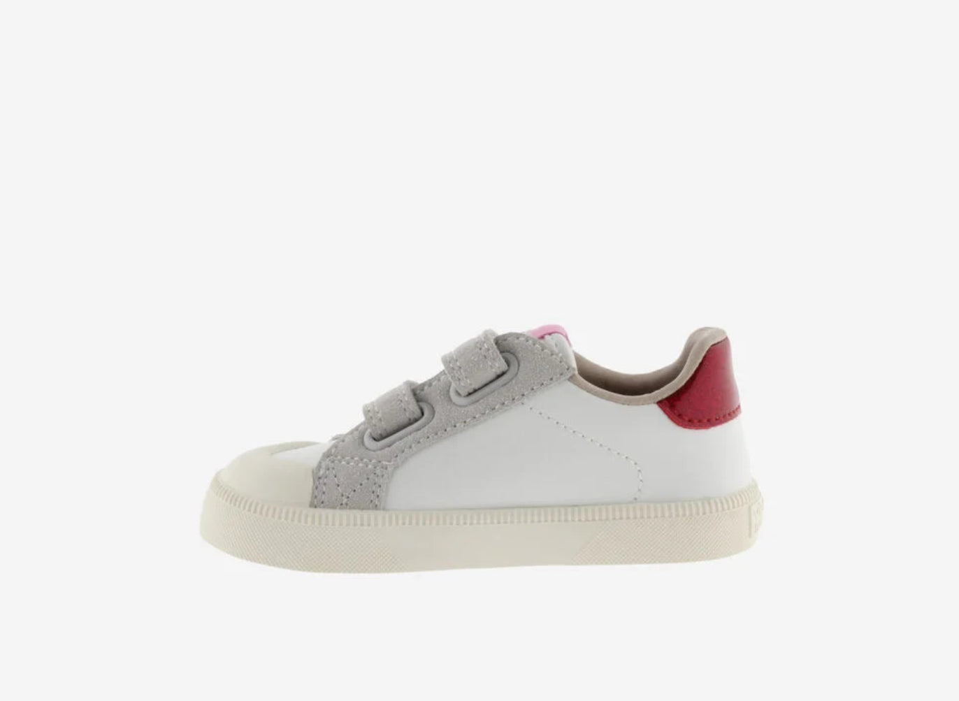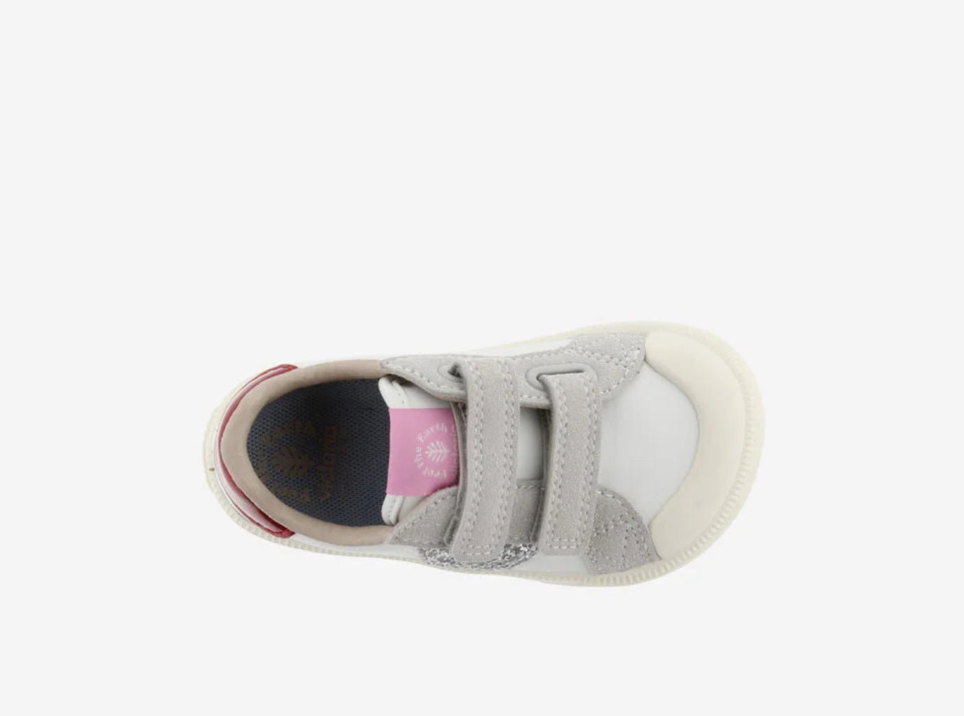 El cierre con dos tiras adherentes (tres a partir de la talla 36) permite un ajuste fácil, rápido y seguro, favoreciendo la autonomía de los niños al calzarse. Su suela de goma ligeramente tostada ofrece una excelente flexibilidad y agarre, ideal para el uso diario.